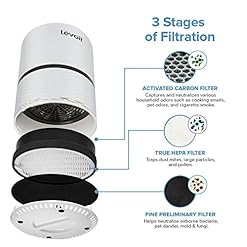 3 Stage Filtration System: Pre-filter, TRUE HEPA Filter & Activated Carbon Filter. It removes 99.97% of dust, smoke, allergies, smokers, odor, mold spores, pollen and pet dander; filters particles as small as 0.3 microns and larger and filters air pollution of PM 2.5